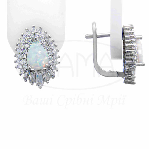 Срібні сережки з білим Опалом та білим цирконом. Срібло 925 проби, покрите родієм. Комплект складається з каблучки, підвіски та сережок.