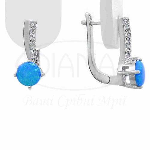 Срібні сережки з синім круглим опалом та цирконом. Срібло 925 проби, покрите родієм. В наборі присутні Каблучка, сережки та підвіска.