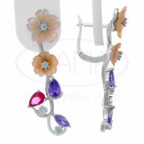 Срібні сережки з кольоровим цирконом та перламутром, виконані в стилі Роберто Браво. Срібло 925 проби, покрите родієм. Складається комплект з каблучки, підвіски та сережок.
