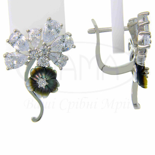 Срібні сережки з білим цирконом та перламутром. Срібло 925 проби, покрите родієм. Комплект виконаний в стилі Роберто Браво, у формі квітів. Складається з каблучки, підвіски та сережок.