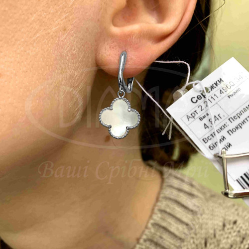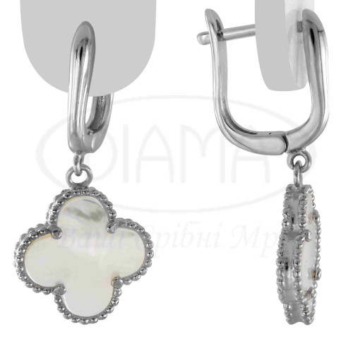 Срібні сережки з білим Перламутром у формі "Клевере". Срібло 925 проби, покрите родієм. Розмір головного елементу 14,5 мм.