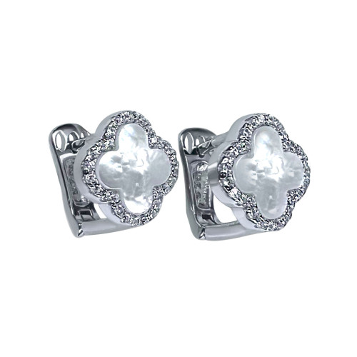 Сережки срібні з білим перламутром та білим цирконом. Срібло 925 проби, покрите родієм. Сережки виготовлені в формі "Клевер". В наборі присутні каблучка, сережки та підвіс. Розмір головного елементу - 11,5 мм.