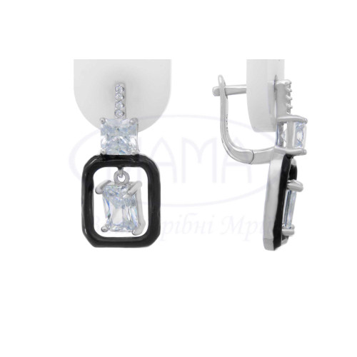 Срібні сережки з білим цирконом та чорною емаллю. Срібло 925 проби, покрите родієм. В наборі присутні каблучка, сережки та підвіска.