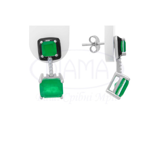 Срібні сережки з зеленим та білим цирконом з чорною емаллю. Срібло 925 проби, покрите родієм.