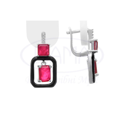 Срібні сережки з червоним цирконом та чорною емаллю. Срібло 925 проби, покрите родієм. В наборі присутні каблучка, сережки та підвіска.