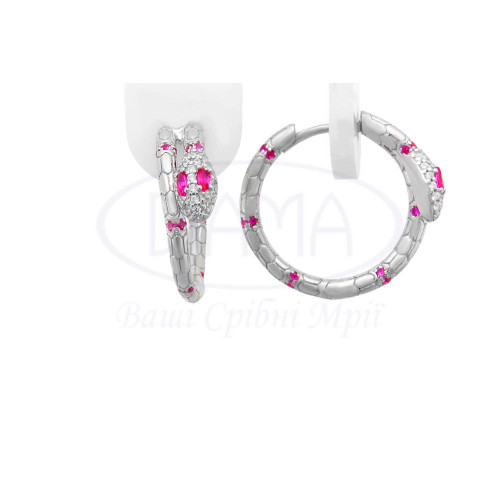 Срібні сережки з білим та малиновим цирконом в формі Змії. Срібло 925 проби, покрите родієм. В наборі є каблучка та сережки.