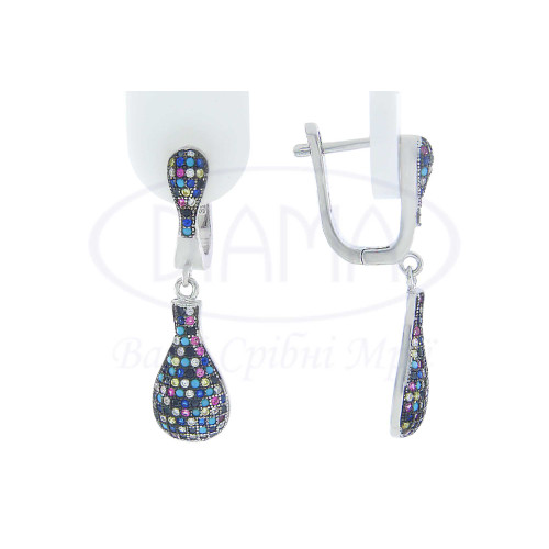 Сережки срібні у формі краплі з кольоровим цирконом. Срібло 925 проби,покрите родієм. У наборі присутні каблучка, сережки та підвіска. Розмір сережки 9х17 мм.