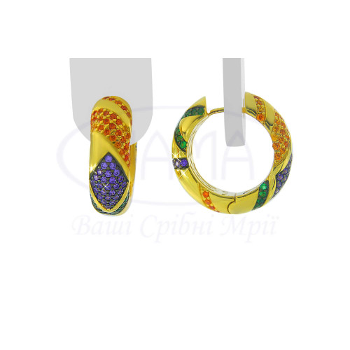 Сережки срібні з різнокольоровим цирконом із зображенням ромба. Срібло 925 проби, покрите позолотою. Ширина сережки 7 мм.