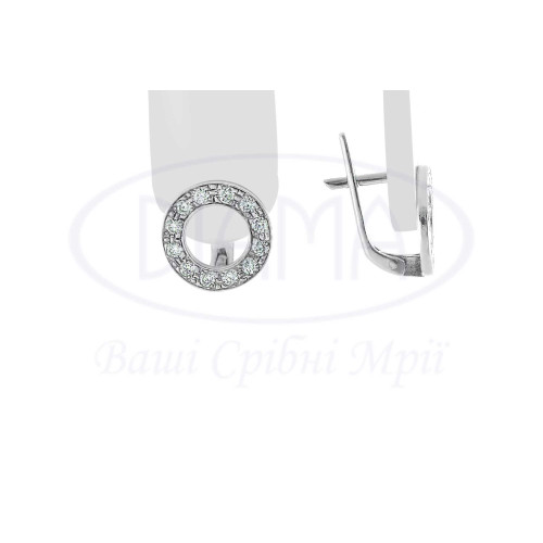 Сережки срібні з білим цирконом у формі круга. Срібло 925 проби, покрите родієм. Діаметр круга 12,5 мм.