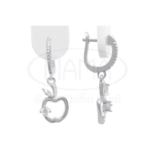 Сережки срібні з білим цирконом у формі яблука. Срібло 925 проби, покрите родієм. В комплекті також є каблучка та підвіска.