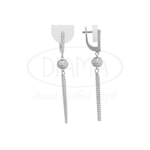 Срібні сережки з кулькою, в усипці з білого циркону та ланцюжками. Срібло 925 проби, покрите родієм. В наборі каблучка, сережки та підвіска. Діамерт 7,5 мм