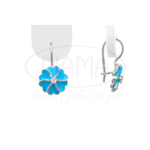 Сережки срібні дитячі з блакитною емаллю та білим цирконом. Срібло 925 проби, покрите родієм. В комплекті каблучка, підвіска та сережки.