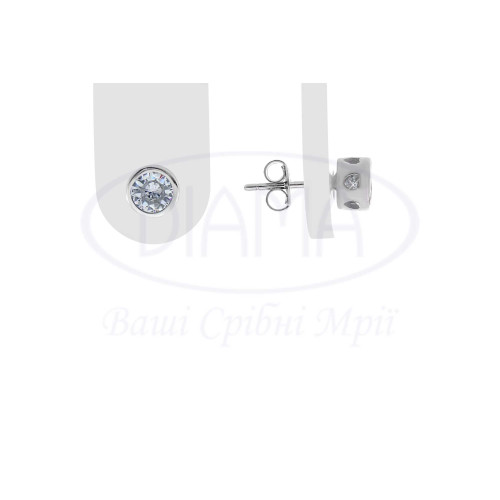 Пусети срібні з білим цирконом у формі круга, розміром 6,2 мм. Срібло 925 проби, покрите родієм.