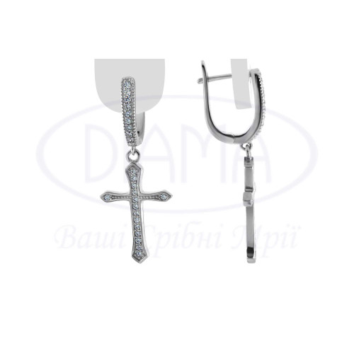Сережки срібні у формі хрестика з білим цирконом. Срібло 925 проби, покрите родієм. Розмір хрестика 15х29 мм.