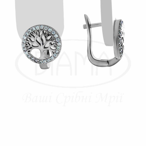Сережки срібні з білим цирконом у формі кола, в середині якого знаходиться дерево. Срібло 925 проби, покрите родієм. Висота сережки 13 мм, діаметр круга 12 мм. В комплекті каблучка, сережки та підвіска.