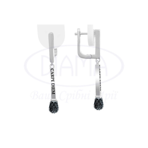 Срібні сережки у формі сірника з чорним цирконом. Срібло 925 проби, покрите родієм. В комплекті також є каблучка та кольє.