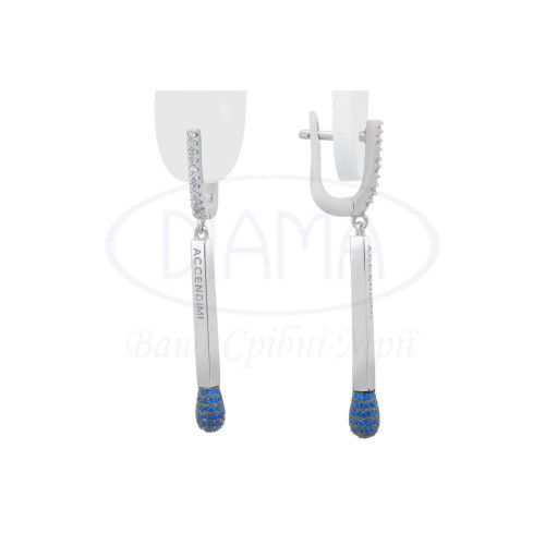Срібні сережки в формі Сірника з синім цирконом. Срібло 925 проби, покрите родієм. В наборі є каблучка, сережки та кольє.
