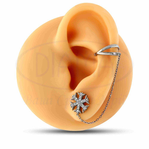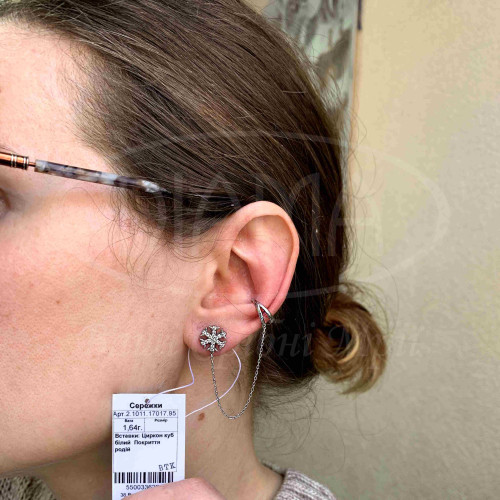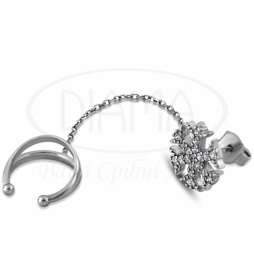 Сережка-каффа з білим цирконом у формі сніжинки та ланцюжка який з'єднує між собою сережку та каффу. Срібло 925 проби, покрите родієм. Розмір головного елементу сережки 11 мм.