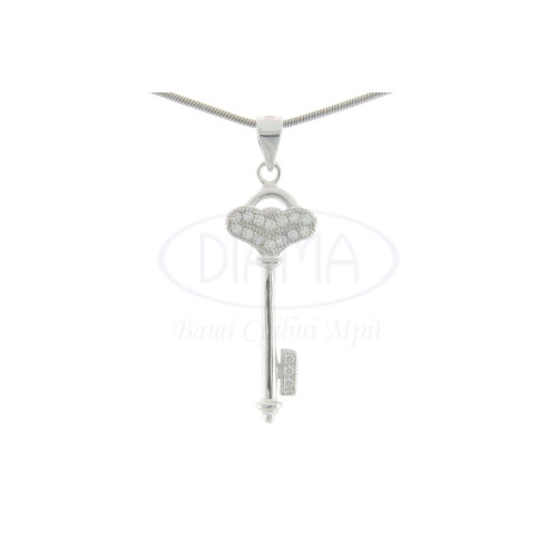 Підвіска срібна у формі ключа прикрашена білим цирконом. Срібло 925 проби, покрите родієм.
