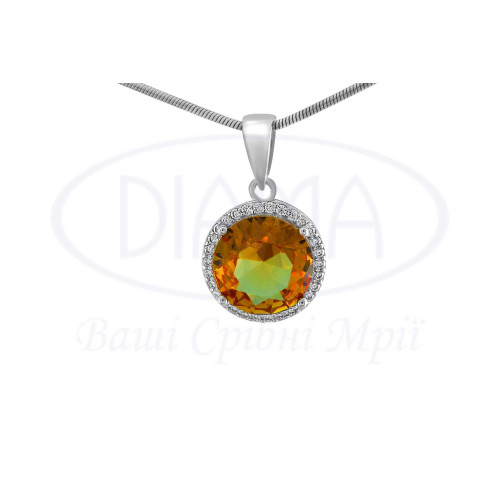 Срібна підвіска в формі кола з Султанітом та білим цирконом. Срібло 925 проби, покрите родієм. Вставка Султаніт (камінь, який змінює свій колір в залежності від освітлення). Може бути зеленим, жовтим, малиновим або яскраво помаранчевим. В наборі присутні каблучка, сережки та підвіска.