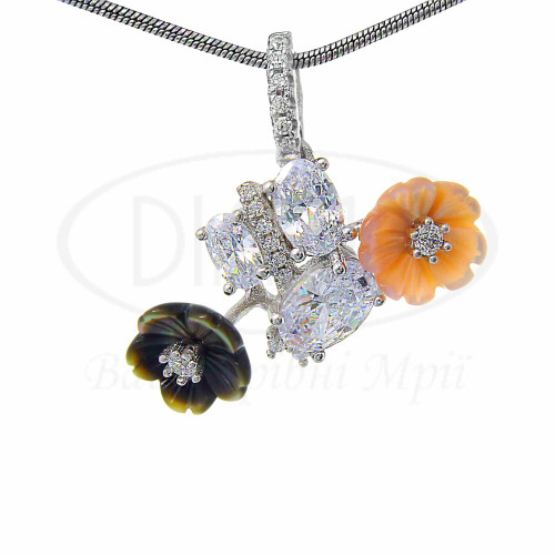 Срібна підвіска з цирконом та перламутром. Срібло 925 проби, покрите родієм. Комплект виконаний в стилі Роберто Браво, у формі квітів. Складається з каблучки, підвіски та сережок.