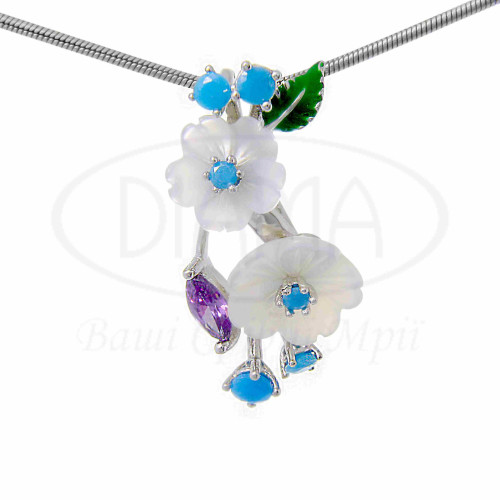 Срібна підвіска з кольоровим цирконом, перламутром та емаллю, в стилі Роберто Браво. Срібло 925 проби, покрите родієм. В наборі присутні каблучка, підвіска та сережки.