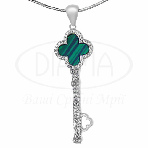 Срібна Підвіска з Малахітом та білим цирконом. Срібло 925 проби, покрите родієм. Підвіску виготовлена в формі ключа і конюшини.