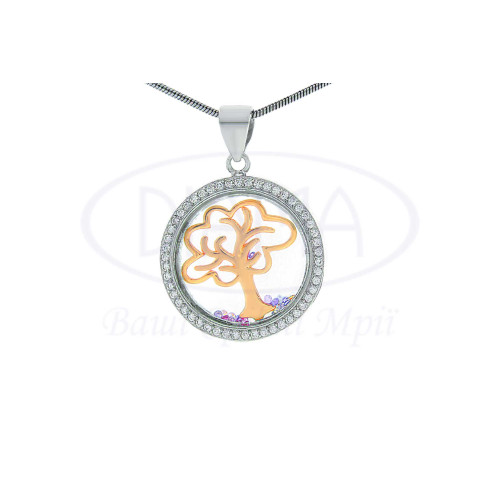 Підвіска срібна у формі кола, закритого з обох боків склом, а в середині дерево та різнокольорові камінці циркону. Срібло 925 проби, покрите родій білий та позолота червона. Розмір підвіски 20мм