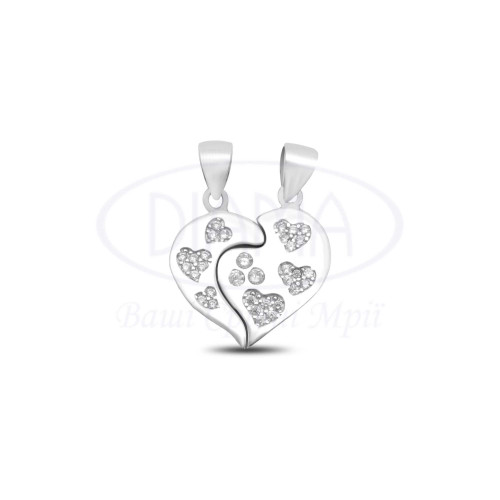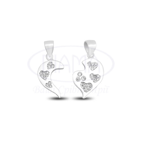 Підвіска срібна яка складається з двох окремих частинок, які зˊєднуючись утворюють серце з камінцями білого циркону. Срібло 925 проби, покрите родієм. Ширина підвіски 19 мм., висота 20 мм.