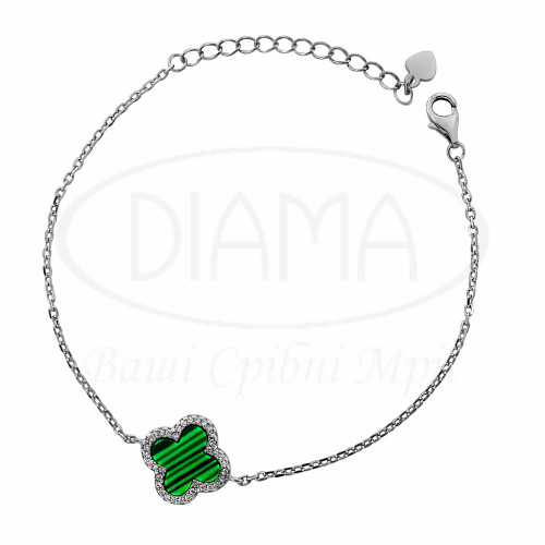 Браслет срібний з Малахітом та білим цирконом. Срібло 925 проби, покрите родієм. Виготовлено в формі "Клевер". Розмір головного елементу - 14 мм. У наборі каблучка, підвіска, браслет, кольє та сережки.