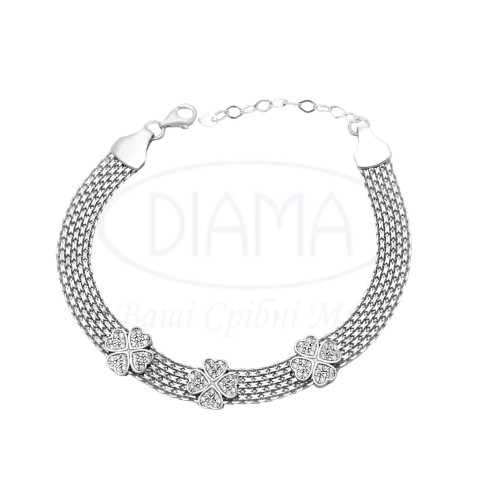 Браслет срібний в стилі Пандора (Pandora) з "Клевером" та білим цирконом. Срібло 925 проби, покрите родієм.