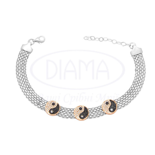 Браслет срібний в стилі Пандора (Pandora) з прикрасою у вигляді знаку "Інь - Янь" з білим та чорним цирконом. Срібло 925 проби, покрите родієм та червоною позолотою.