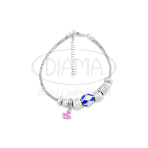Срібний браслет з білим цирконом та емаллю синього та білого кольору. Срібло 925 проби, покрите родієм. Комбінація додаткових "шармів" може відрізнятися від фото.