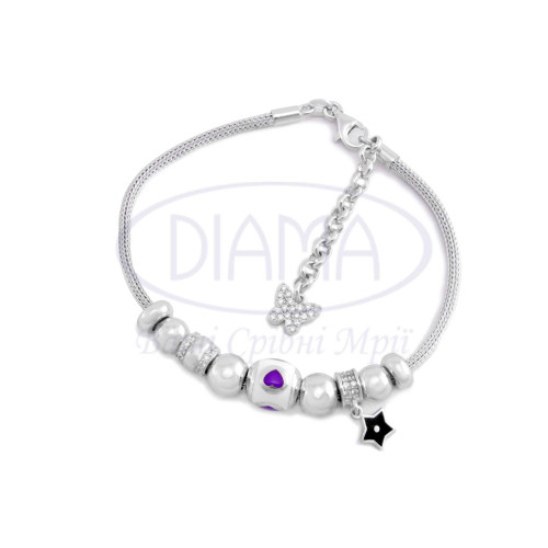 Срібний браслет з білим цирконом та емаллю фіолетового та білого кольору. Срібло 925 проби, покрите родієм. Комбінація додаткових "шармів" може відрізнятися від фото.