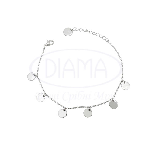 Браслет срібний з круглими пластинками. Срібло 925 проби, покрите родієм. Розмір круга 6,5 мм.