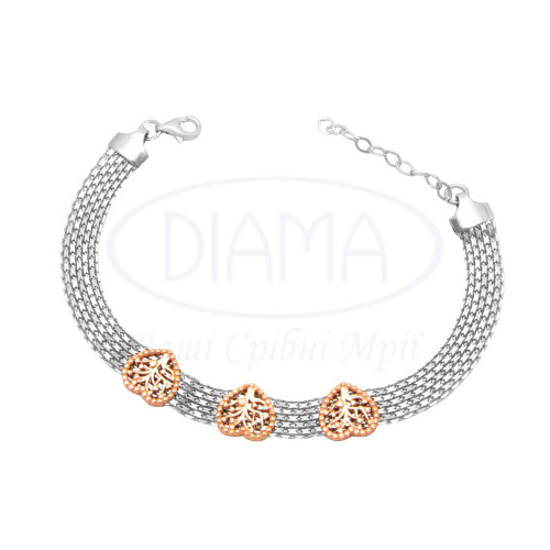 Браслет срібний в стилі Пандора (Pandora) з прикрасою у формі серця, в середині якого дерево. Срібло 925 проби, покрите родієм та червоною позолотою.