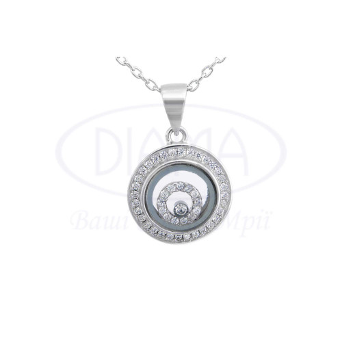 Срібне кольє з колом та білим цирконом під склом. Срібло 925 проби, покрите родієм. В наборі є каблучка, сережки та кольє.
