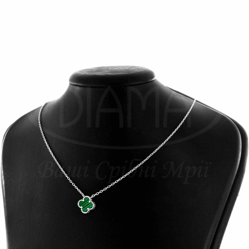 Кольє срібне з Малахітом. Срібло 925 проби, покрите родієм. Кольє виготовлено в формі "Клевер". В наборі присутні сережки, каблучка, браслет, кольє та підвіска. Розмір головного елементу 11 мм.