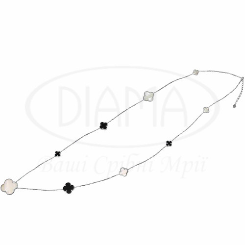 Срібне кольє з білим перламутром та оніксом. Срібло 925 проби, покрите родієм. Кольє виготовлене в формі "Клевер". В наборі присутні кольє та браслет. Розмір головних елементів - 24 мм, 14 мм та 11 мм. Додатковий ланцюг надає можливість змінювати розмір.