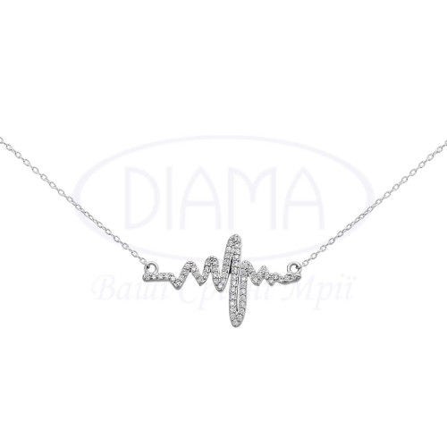 Срібне кольє з білим цирконом у формі маленького серцебиття. Срібло 925 проби, покрите родієм. В наборі присутні каблучка, сережки, браслет та кольє.