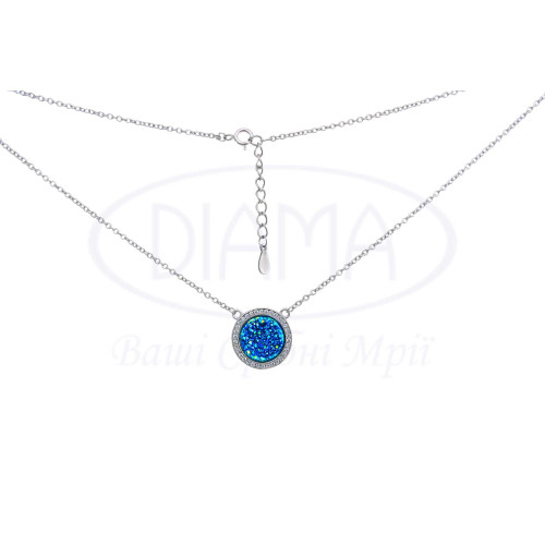Кольє срібне з синім кварцем та білим цирконом у формі кола, розміром 16 мм. Срібло 925 проби, покрите родієм. В наборі присутні каблучка, підвіска, браслет та кольє.