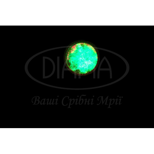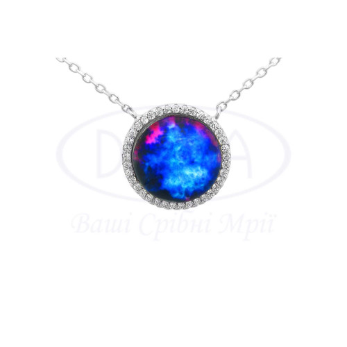 Кольє срібне з ювелірним склом, що світиться в темряві, а також з білим цирконом. Срібло 925 проби, покрите родієм. Розмір головного елементу 17 мм.