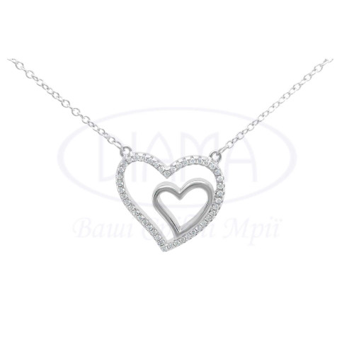 Кольє срібне "Подвійне Серце" з білим цирконом. Срібло 925 проби, покрите родієм. Розмір 20*20 мм.