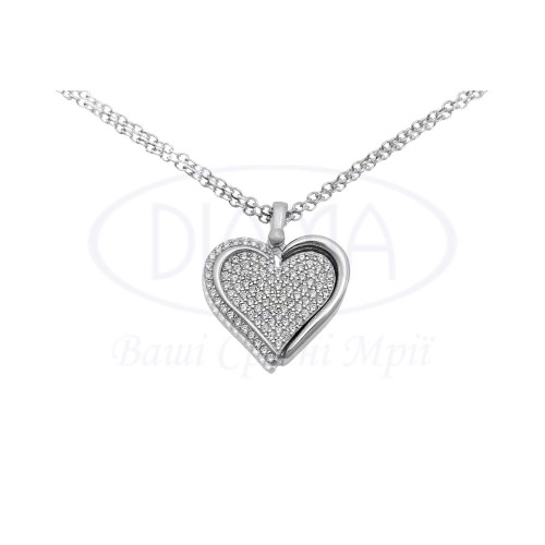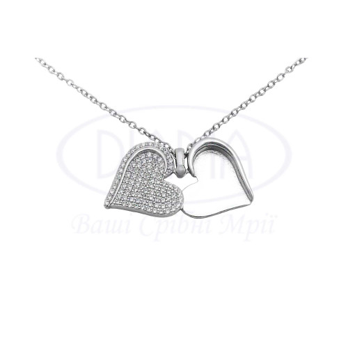 Срібне кольє з підвіскою, виконаною у формі серця з білим цирконом, яке розˊєднується та відкриває друге сердечко, на яке Ви можете нанести гравіювання. Срібло 925 проби, покрите родієм. В комплекті є кольє та підвіска.