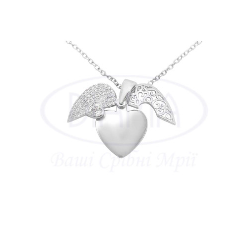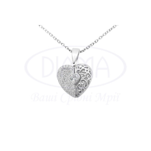 Срібне кольє з підвіскою, виконаною у формі серця з білим цирконом, яке розˊєднується та відкриває друге сердечко, на яке Ви можете нанести гравіювання. Срібло 925 проби, покрите родієм. В комплекті є кольє та підвіска.