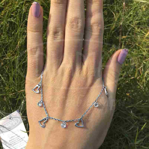 Кольє срібне з пластинками у формі серця та білим цирконом. Срібло 925 проби, покрите родієм. Пластинки 7 шт. розміром 8 мм, та 6 шт. камінців 4 мм.