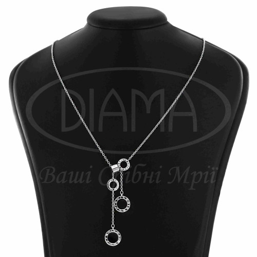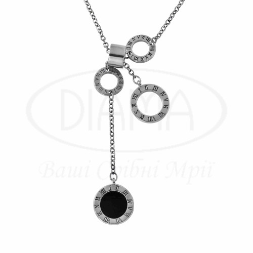 Кольє срібне з чорною емаллю у формі круга, що нагадують годиник з Римськими цифрами. Срібло 925 проби, покрите родієм. Діаметр головного елементу кольє (круг) 9 та 11 мм.