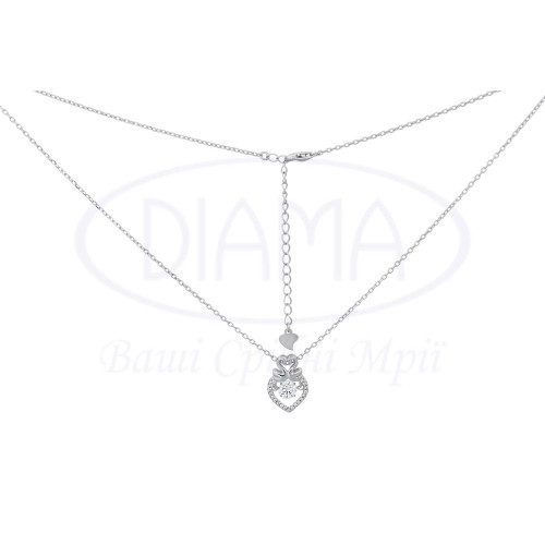 Срібне кольє в формі серця з лебедями та великим цирконом по центру. Срібло 925 проби, покрите родієм. Розмір головного елементу 11,5 * 16 мм.