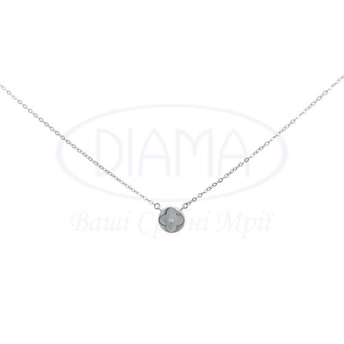 Срібне кольє з перламутром, виконано у формі кругу з клевером та цирконом. Срібло 925 проби, покрите родієм. Розмір головного елементу 10,5 мм.