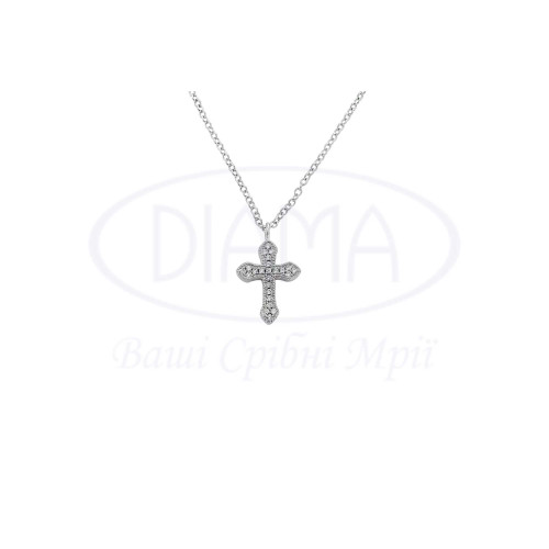 Кольє срібне з білим цирконом у формі хрестика. Срібло 925 проби, покрите родієм. Розмір головного елементу 20х12 мм.